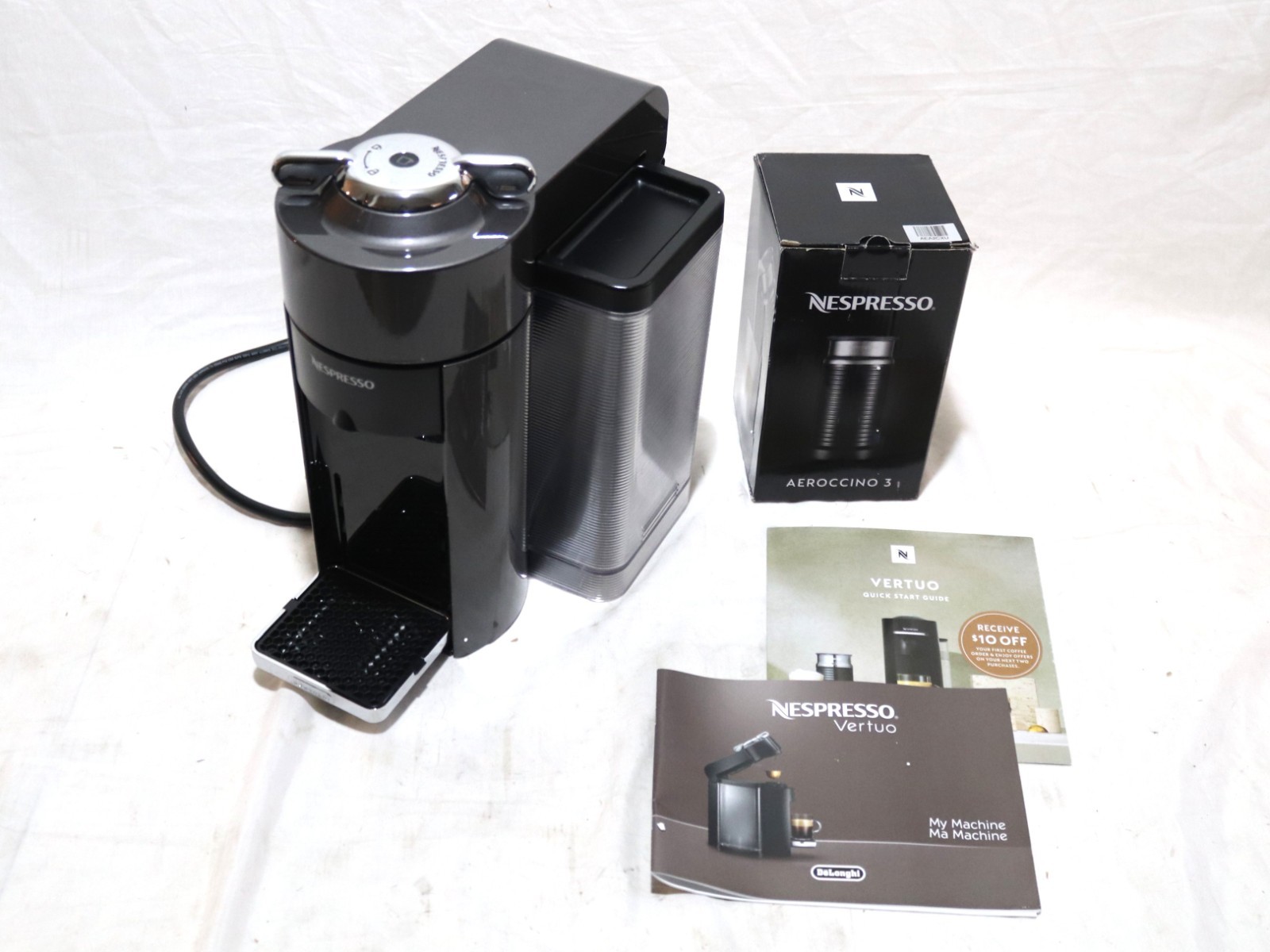 INCLUDED: Vertuo Espresso Machine, Pod Catching Bin & Lid, Milk Frother, Drip Tray, User Manuals. What you see in the pictures is what you get! MISSING: Water Tank & Lid.