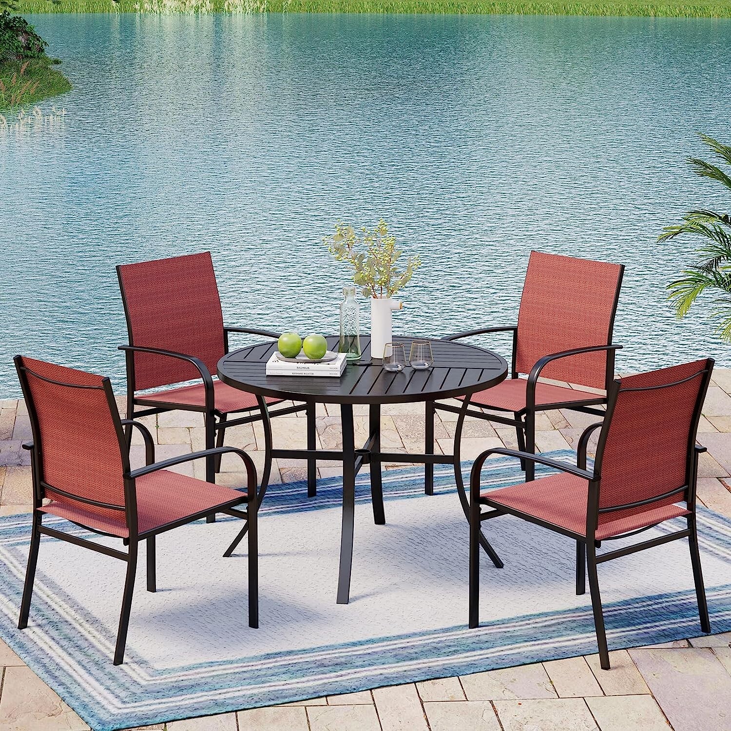 5 PIECE PATIO DINING SET: Outdoor patio set including 4 textilene chairs and 1 outdoor dining table with umbrella hole. The modern design is perfect for your patio, garden, lawn and yard. Assembly required: Easy to assemble with clear instructions and all necessary accessories included.