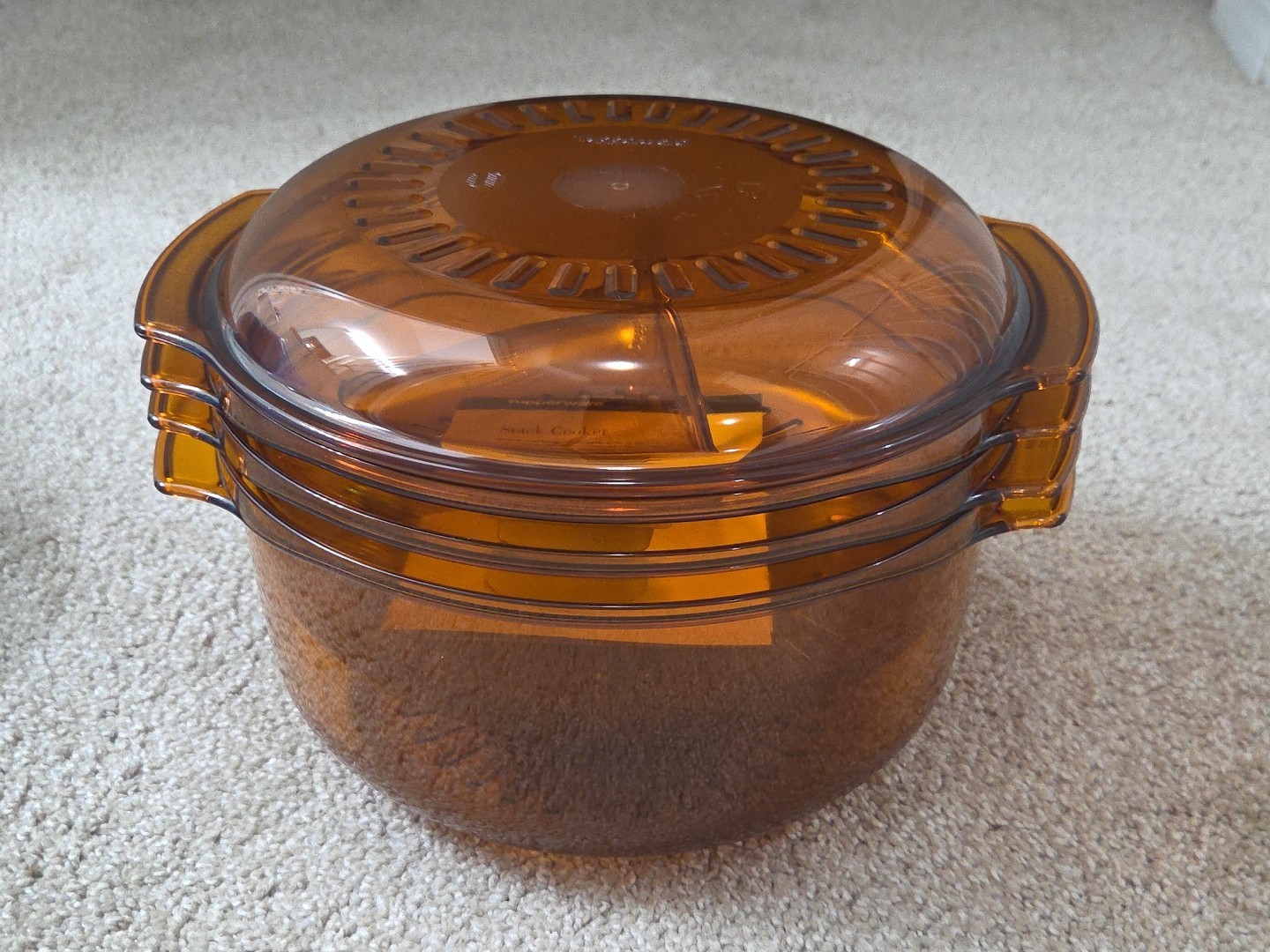 The New Tupperware Microwave Stack Cooker Set in Amber Color is a rare and valuable addition to your kitchen. This 6-piece set includes a lid and steamer, made of BPA-free plastic for safety. With a capacity of 3 quarts, this round cooker is designed for preparing full meals and desserts in the microwave. The non-stick surface coating makes it easy to clean, and the lifetime manufacturer warranty ensures durability. Create delicious meals with this convenient and versatile Tupperware product.