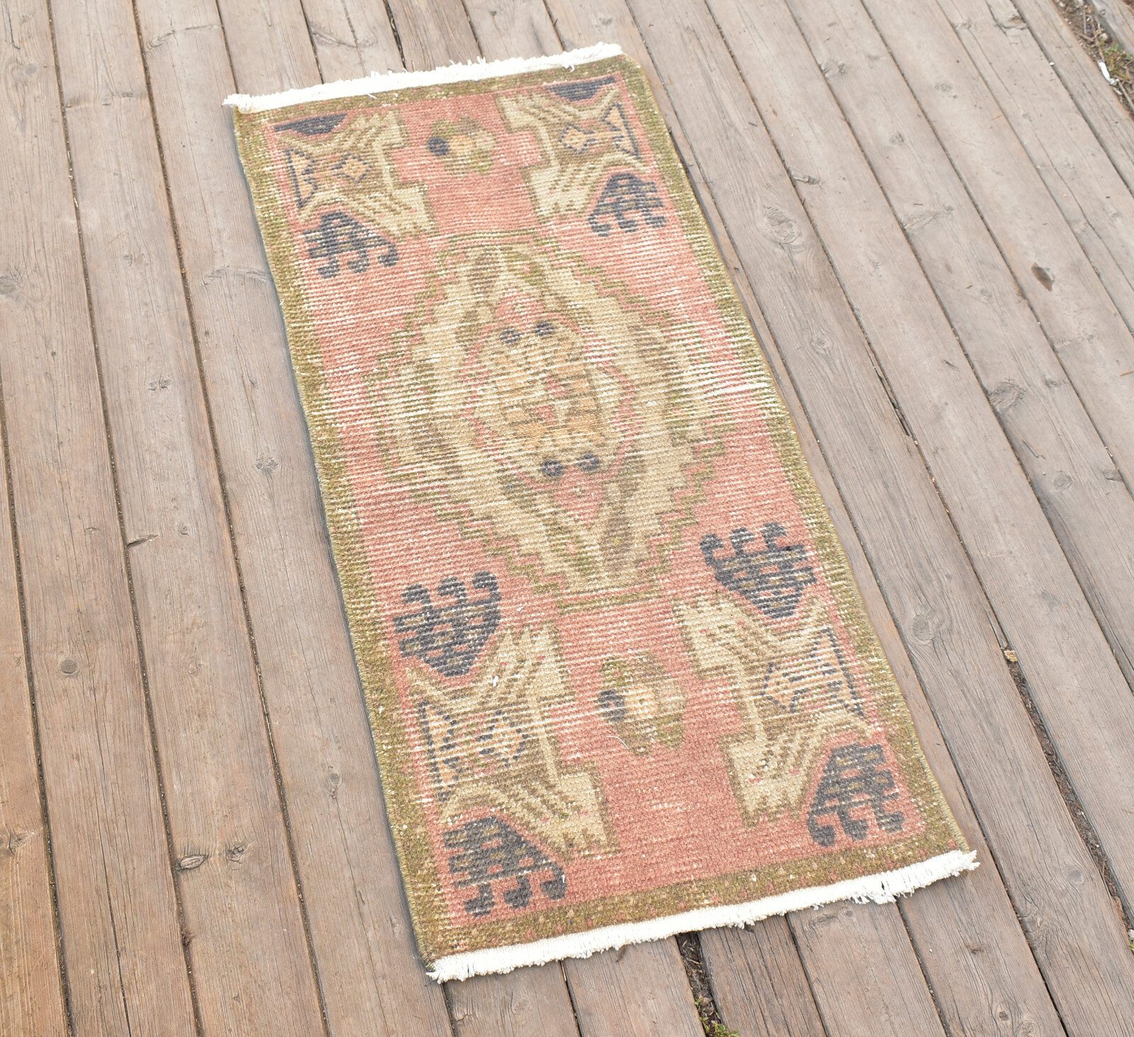 This multi-colored rug features a regional design and is made of cotton and wool. Perfect for any room, this rug can add warmth and texture to your floors. The knotted production technique used to make this original rug door mat was popular in Turkey during the 1980s.