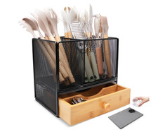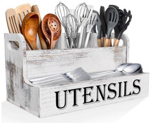 This Extra Large Kitchen Utensils Holder with 4 Compartments is a stylish and functional addition to any farmhouse-style kitchen. The white wooden holder stands at 7.68 inches tall and 13.58 inches wide, providing ample space for all your cooking tools. With four separate compartments, this utensil holder keeps your kitchen organized while adding a touch of charm with its rustic design. Perfect for storing knives, spoons, spatulas, and more, this kitchen essential is both practical and aesthetically pleasing.
