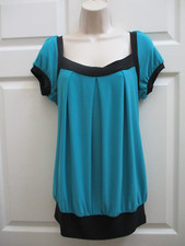 WRAPPER Women's Large Blouse Turquoise Blue Top Black Trim Balloon Style E NWT | ✔ Check At Store | $28.00 |