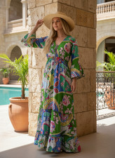 Women Green Floral Soft Maxi Wide Bell Sleeve Boho Tiered Summer Vacation Dress