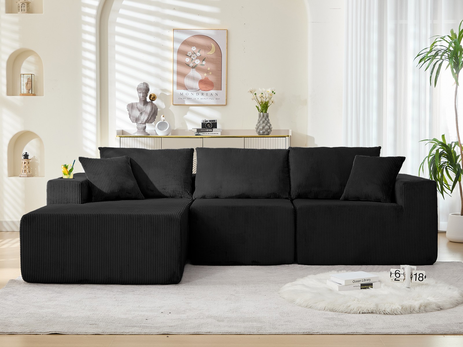 Alias: comfy couch, boneless sectional couch, boneless sofa,deep seat couch, boneless couch sectional. 107" Cloud Sectional Couch, Modular Sectional Sofa with L-Shape Chaise, Corduroy Boneless Couch with Deep Seat, Upholstered Sofa for Living Room, No Assembly Required(Left-Facing Chaise, Grey/White/Black).