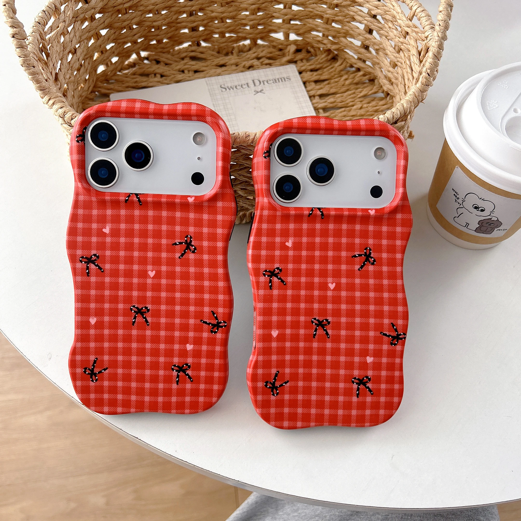 Cute Bowknots Grid TPU+PC Shockproof Phone Case for iPhone 13 14 15 16 17 Pro Max Heart Wave Edges Christmas Cover Xmas Gifts