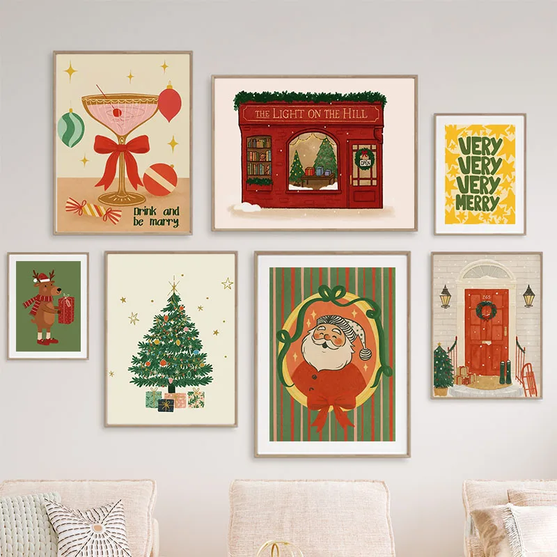 1pc Canvas painting Santa Claus Christmas Tree Deer Drink Gift Party Posters Prints Canvas Painting Nordic Wall Art Picture For