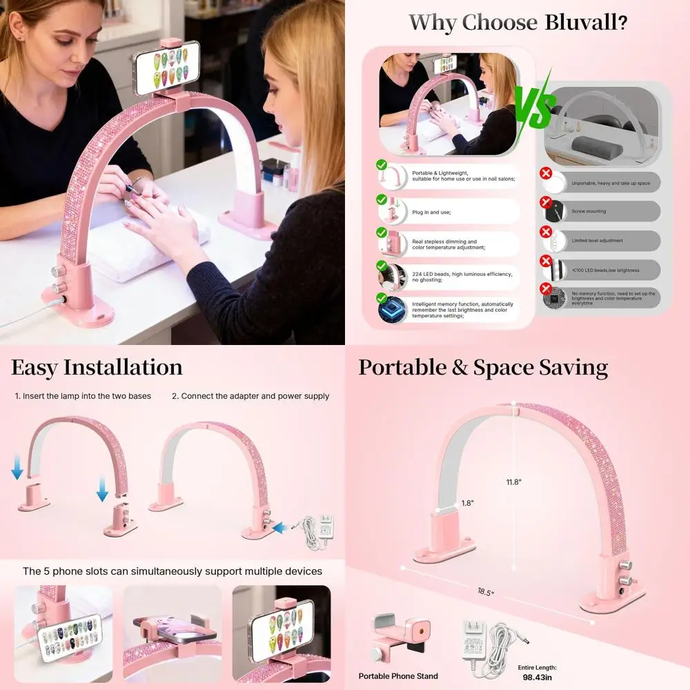 Portable LED Nail Desk Lamp with Adjustable Brightness and Color Temperature for Nail Tech, Eyelash, Tattoo, and Makeup (Pink)