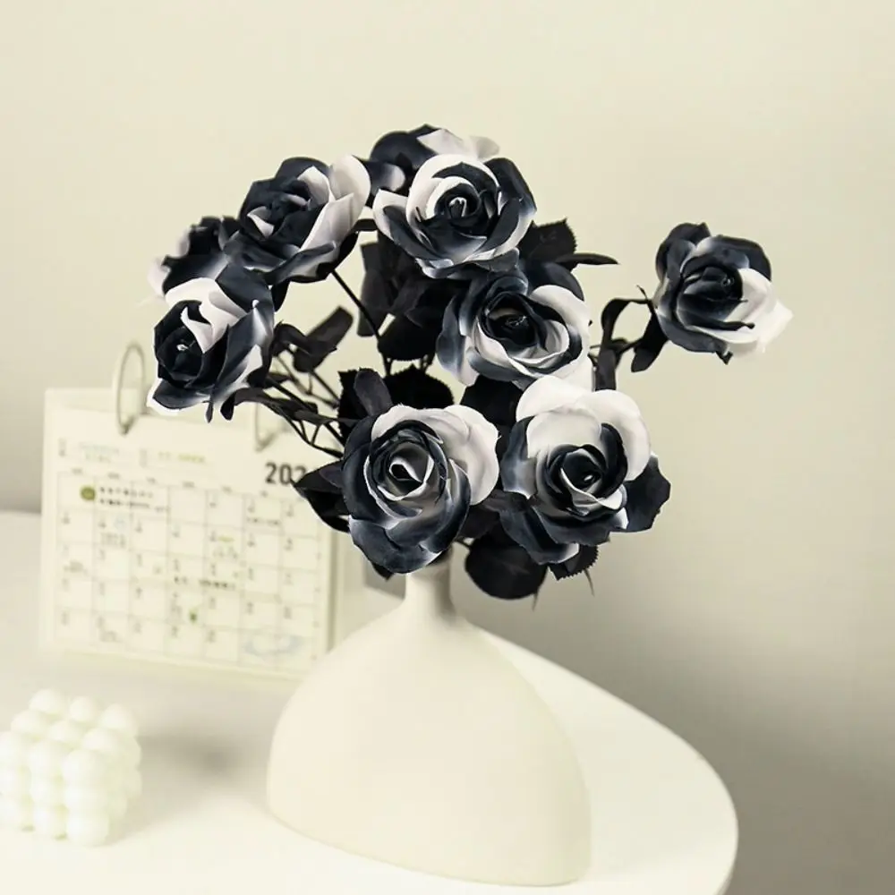 Black White Halloween Artificial Rose Flowers Gothic Soft Silk Faux Flowers Exquisite Real Touch Simulation Flowers